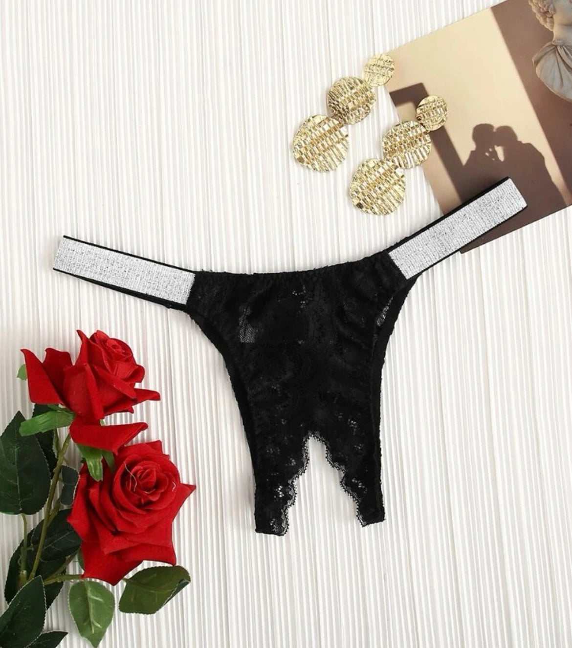 Lace insert contrast tape crotchless thong