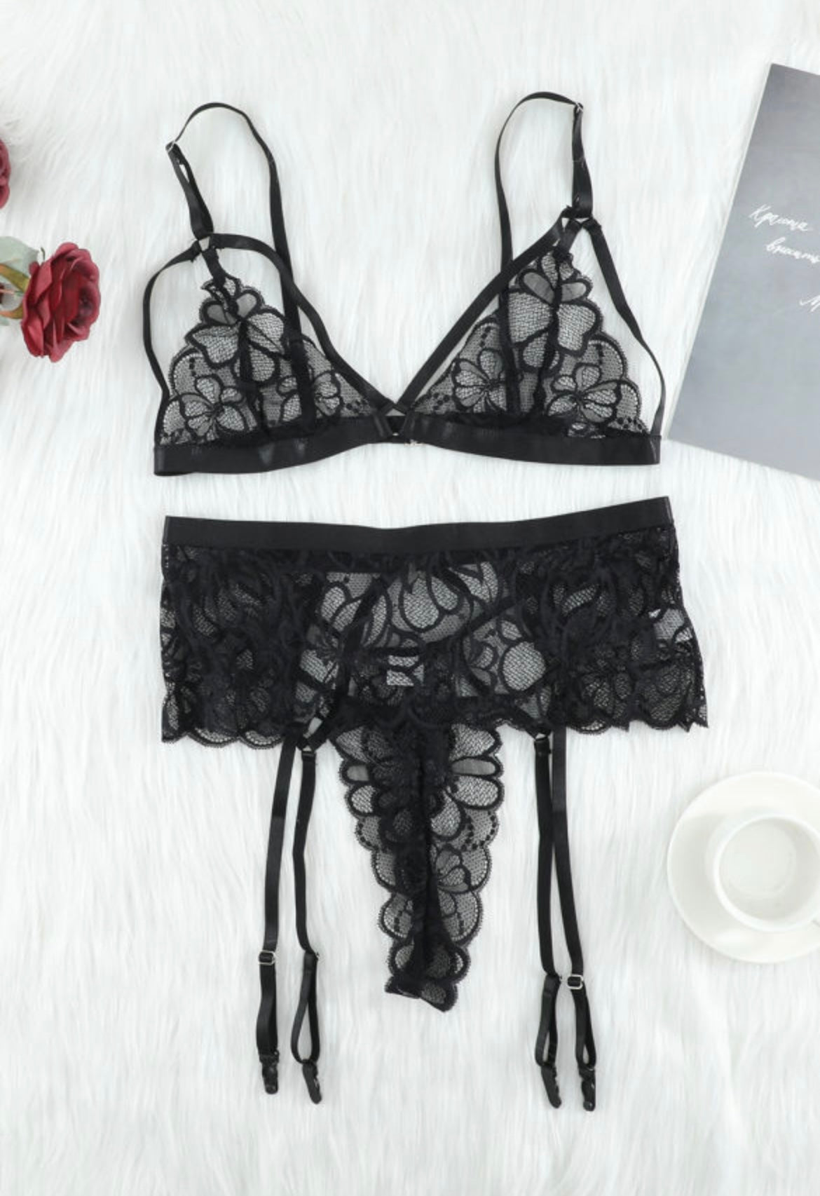 •The 3pcs lingerie set has the bra, thong and garter belt