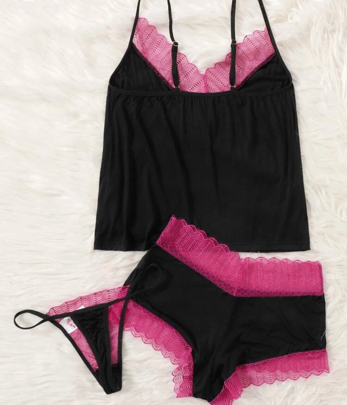 3 piece set include a lace top, panties and matching thong to switch it up.