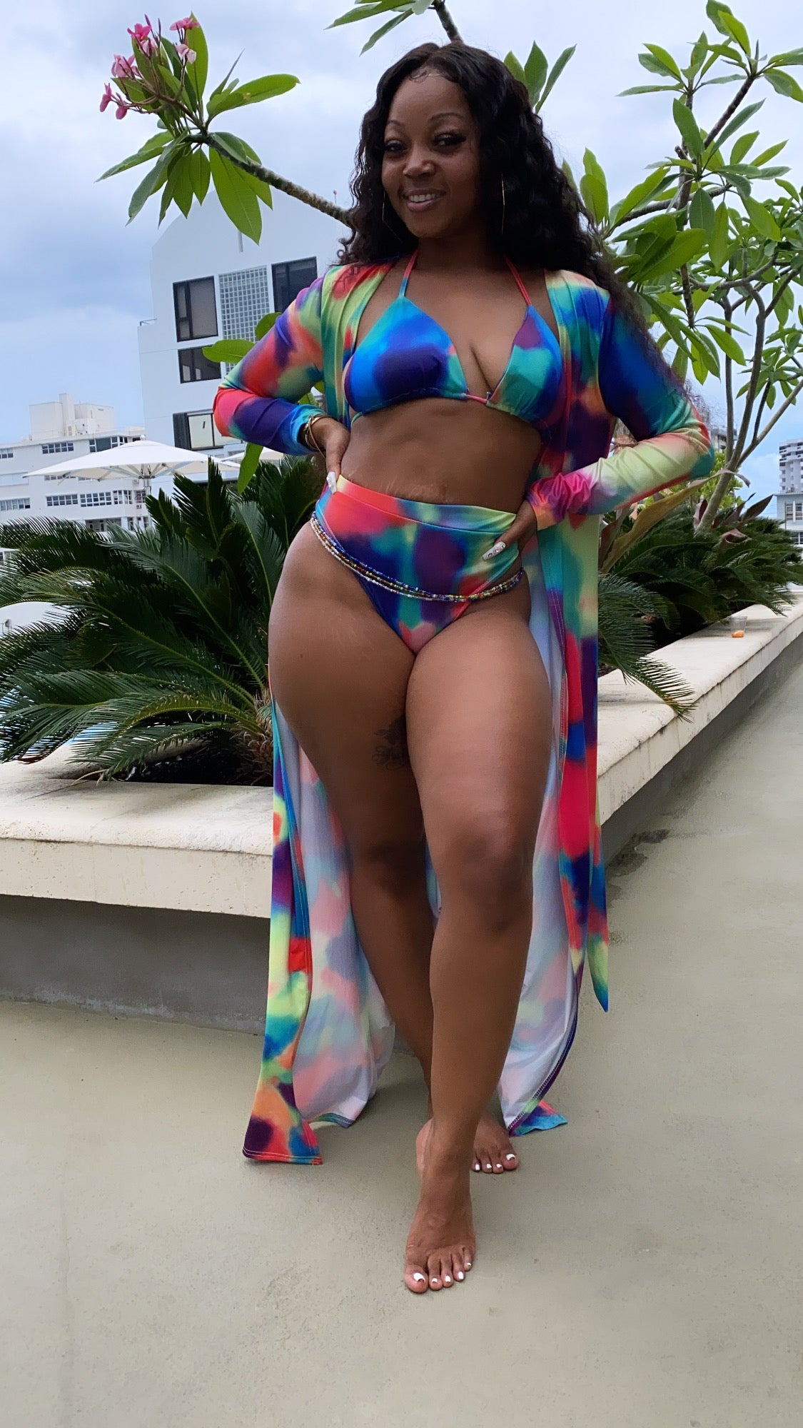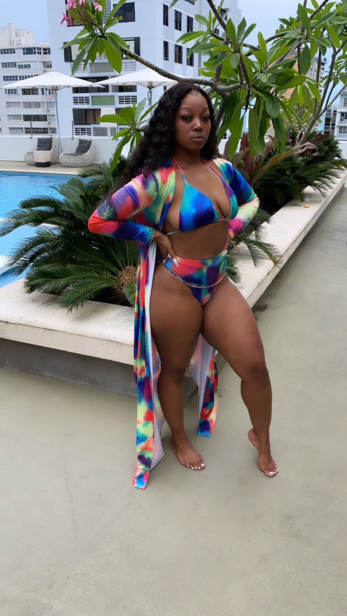 Beaching in Paradise is a bikini set with coat , made with high quality and textured fiber ! The fit runs casual, with normal stretch. This bathing suit is a must have for vacations !